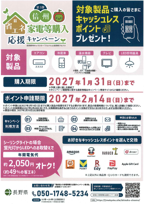 長野県では、家庭のエネルギー費用負担の軽減と温室効果ガス削減を目的とした、「信州省エネ家電等購入応援キャンペーン」が令和8年3月27日より始まっています。