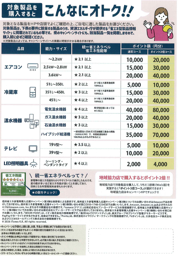 期間中、対象店舗にて一定基準を満たした省エネ家電(エアコン・冷蔵庫・給湯機・テレビ・LED照明など)をご購入いただくと、性能や製品に応じたポイントが付与されます。